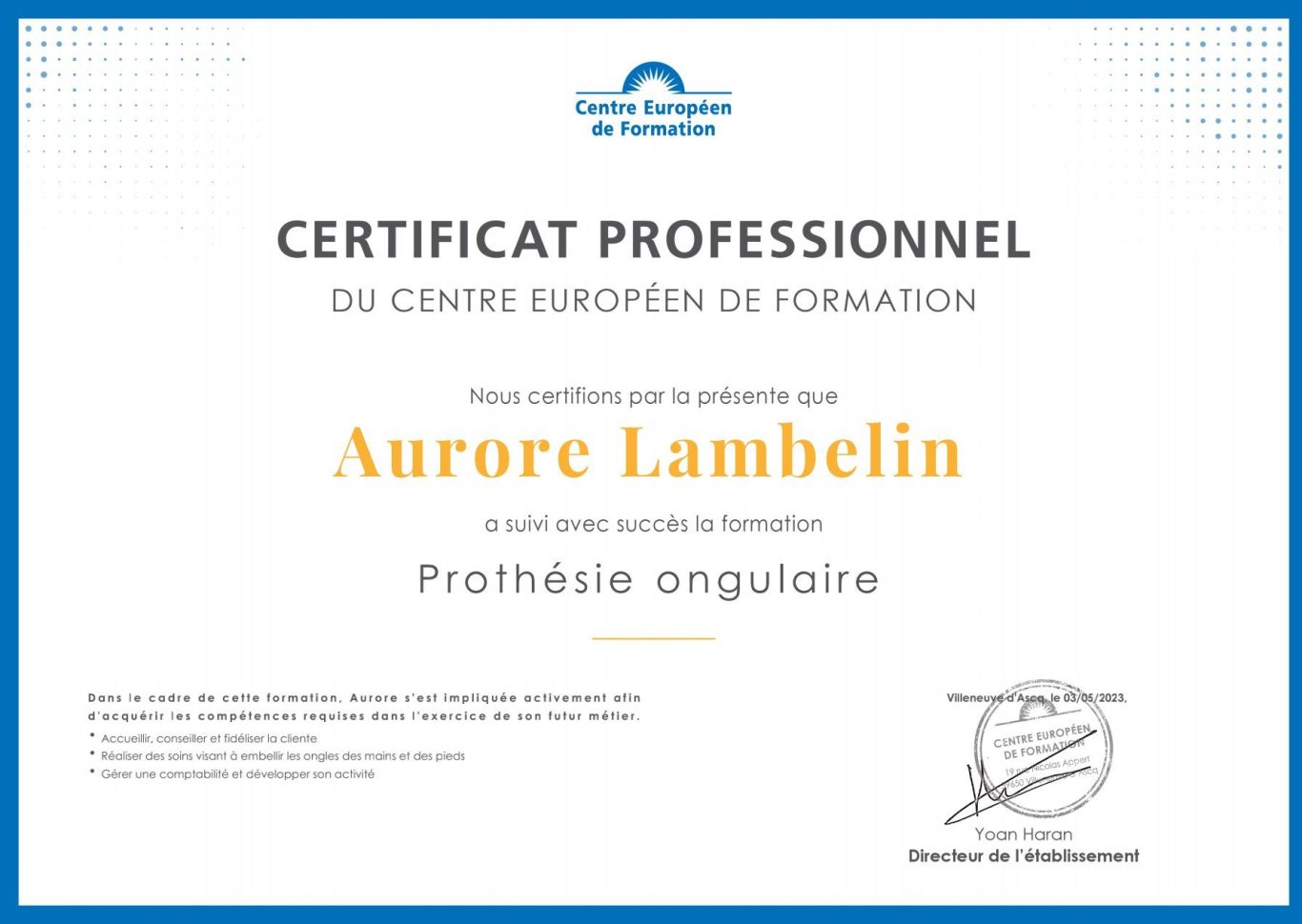 Afin de pouvoir exercer en tant que prothésiste ongulaire, j'ai d'abord effectué une formation auprès du Centre Européen de Formation sur deux années. Dans le cadre de cette formation j'ai appris à développer diverses capacités. En premier lieu, j'ai appris à devenir prothésiste ongulaire en apprenant les règles d'hygiène et de sécurité applicables dans ce domaine ainsi que les différentes techniques d'onglerie afin de vous satisfaire au mieux. J'ai également appris à gérer ma comptabilité et à développer mon activité.